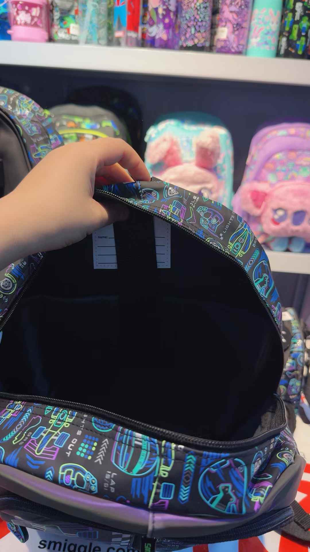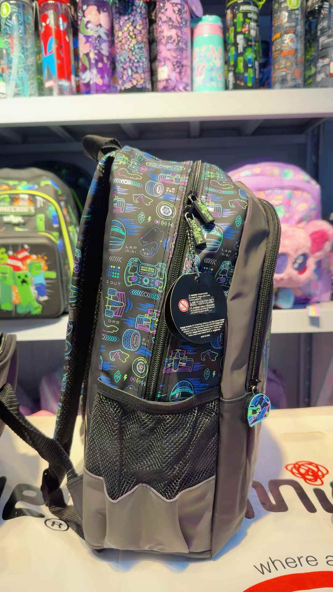 It has three zipped compartments to stash your stationery, tech, snacks and more! Plus dual drink bottle sleeves and padded adjustable shoulder straps. It also has handy side clips that attach to our Oblong Attach Lunchbox for super easy lunch storage. Check out the extra design details including character zips, a silicone badge and graphic print!